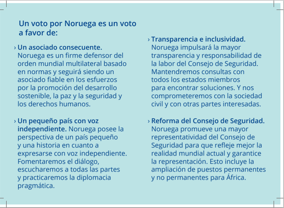 Noruega contribuye a la solución de problemas de manera eficaz, fiable y pragmática, y cuenta con vasta experiencia en los campos de resolución de conflictos, consolidación de la paz, desarrollo sostenible y respuesta humanitaria. Noruega concede importancia al fortalecimiento de la capacidad de las Naciones Unidas para abordar los desafíos globales a los que se enfrenta la comunidad internacional. Como miembro del Consejo, intentará construir puentes y encontrar soluciones que obtengan un amplio apoyo.