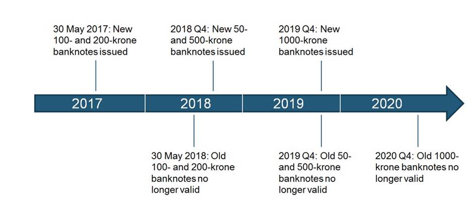② ノルウェー中央銀行オスロ本店、またはトロムソ、トロンハイム、ベルゲン、スタヴァンゲルの取扱窓口に持参のうえ交換。(但し上限額はNOK 10 000 - 限度額を超える場合は①の方法で手続き。)