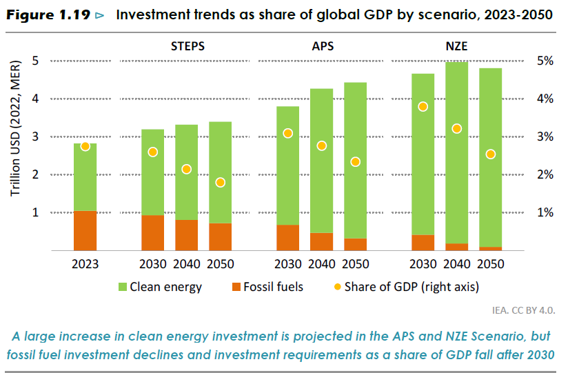 Når det gjelder fossilt, er fortsatte investeringer relevant i alle scenarier: i STEPS for å møte økt etterspørsel mot 2030, og i APS og NZE for å unngå for tidlige investeringskutt med påfølgende volatile priser og ustabile markeder. IEA understreker at reduserte investeringer i fossil energi må koordineres med tiltak og investeringer som reduserer etterspørselen, som utrullingen av ren energi. Fortsatte investeringer er i tillegg viktig for å gjøre olje- og gassvirksomheten mindre utslippsintensiv.