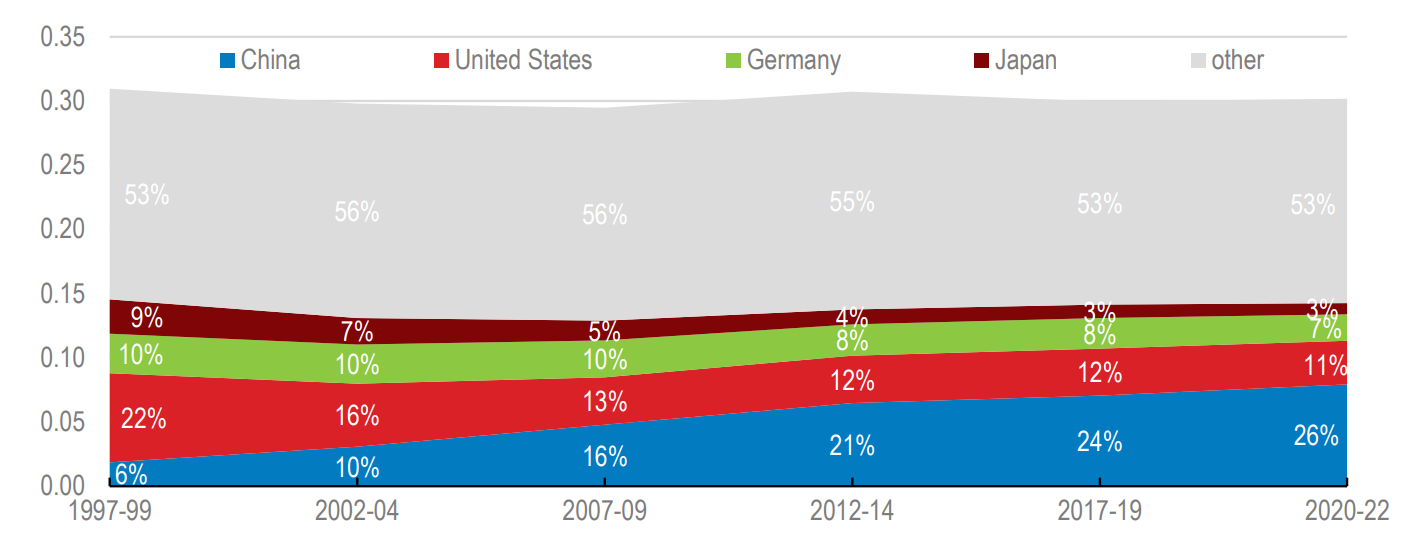 Figur 1 viser hvordan ulike land bidrar til konsentrasjonen av verdens import: et fåtall land dominerer, og Kina er en sentral leverandør som står for rundt 26 % av verdens import.