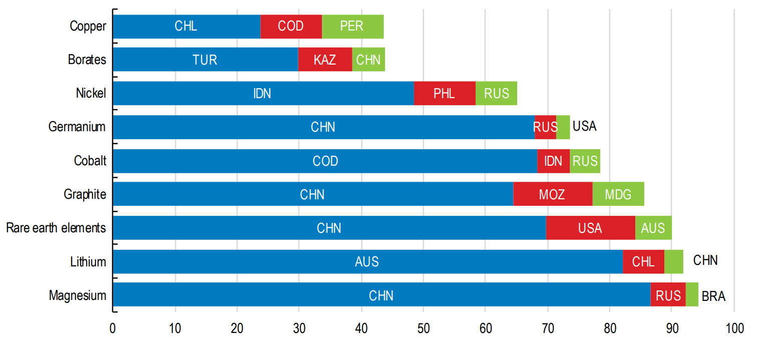 Produksjon av kritiske varer som halvledere og kritiske råmaterialer er konsentrert i få leverandørland, et resultat av spesialisering og stordriftsfordeler. Dette har skapt sårbarhet og gjør forsyningskjeder mer utsatt for sjokk og geopolitiske spenninger.