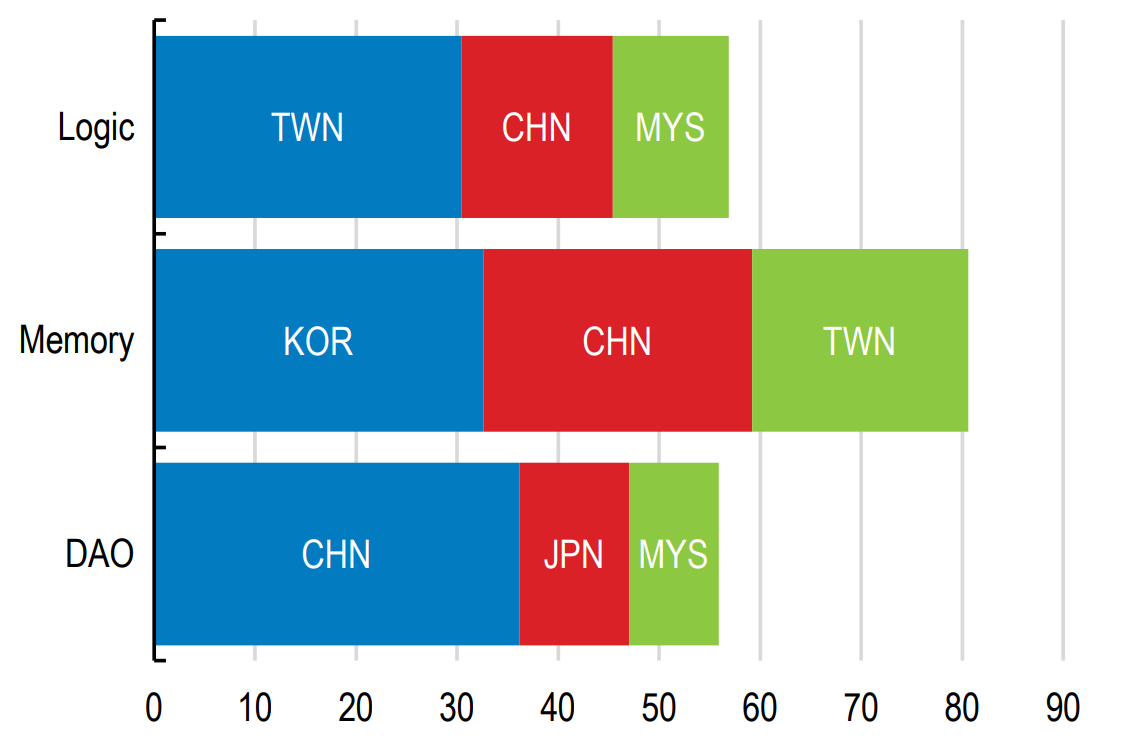 Produksjonen av halvledere er sterkt konsentrert i et lite antall land, hovedsakelig i Øst-Asia. Over 90% av verdens mest avanserte logikkbrikker produseres av ett selskap – TSMC – i Taiwan og for minnebrikker som utgjør en femtedel av verdien til halvleder-eksportmarkedet, kontrollerer topp 3 eksporterende land over 80% av markedet (Figur 2).